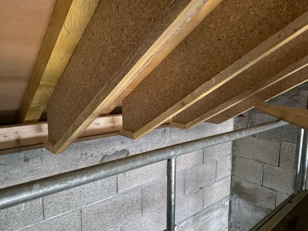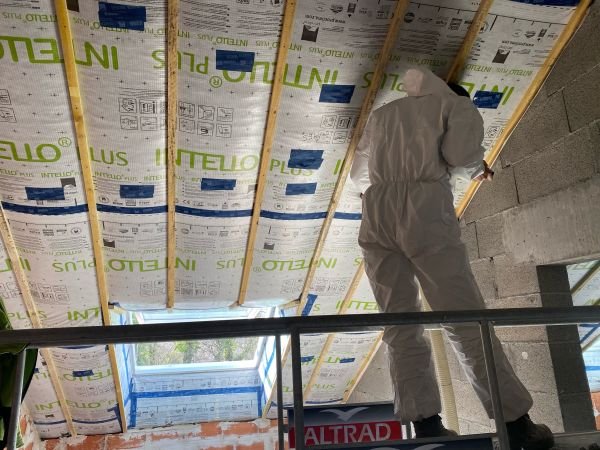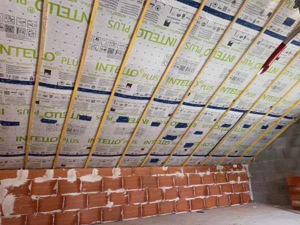 Pour cette maison construite en 2021, pour laquelle nous avons réalisé la charpente, la couverture, la zinguerie et les Velux, le client désirait une isolation performante des rampants de toiture.
