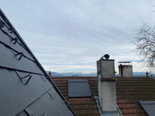 La tour centrale a été agrémentée d’une belle verrière de Velux, créant une vraie lucarne, presque un balcon vers le jardin, avec vue sur le Mont-Blanc!