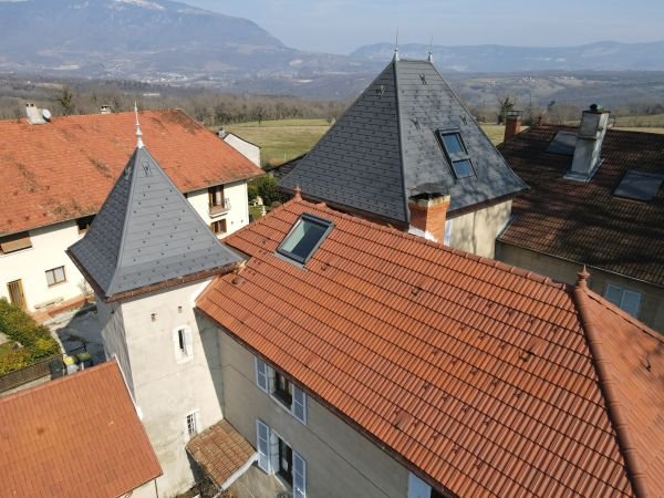 La tour centrale et la petite tour ont été couvertes avec des éléments de bardeau aluminium de chez Prefa, coloris gris sombre, qui leur permet de retrouver le style de l’ardoise d’antant ainsi qu’une longévité et une sérennité accrue.