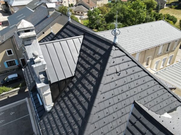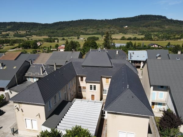 La Mairie de Brénod a subi un relooking durant l’été. Nous avons déposé la vieille ardoise en fin de vie, purgé et remplacé le bois qui a subit le poids des années et apporté un coup de jeune à la toiture en posant une couverture en tuiles terre cuite EDILIANS HP10 ardoisée. Cette tuile plate ardoisée était une alternative esthétique et économique à l’ardoise.