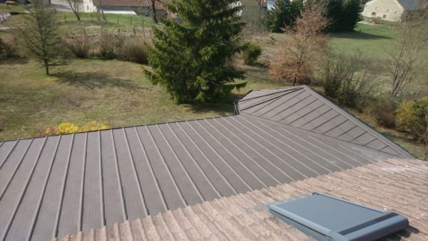 La couverture de la strucutre ajoutée a été réalisée en Tuiles Prefa © coloris brun. Cette couverture aluminium a été la solution idéale de couverture. En effet, sa légèreté a été un atout primordial pour la conception de la structure, et son aspect s’est parfaitement accordé au reste de la maison. Les habillages et les gouttières sont également réalisés en aluminium Prefa en coloris brun, afin de créer un ensemble esthétiquement coordonné.